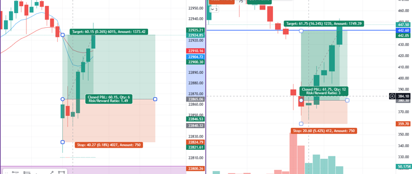 In today's trading session, we initiated a long position on the Nifty 50 Index with a stop-loss set at 40 points and a target of 60 points. The market's favorable movement allowed us to achieve our target with ease.