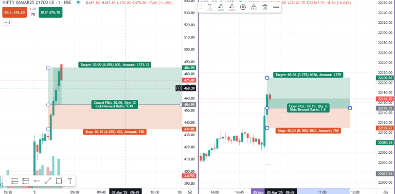 Today, we initiated a long position by purchasing Nifty 50 21700 Call option contracts, setting a target of a 30-point gain and a 20-point stop loss. Our target was successfully achieved